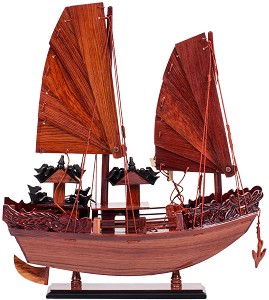 Ръчно изработен модел на кораб "Джонка" с дървени платна. Моделът е изработен ръчно от опитни и квалифицирани занаятчии. Не са използвани модели за сглобяване, а декорациите са прецизно изработени. Платната запазват своята форма и не се нагъват. За да завършите кораба трябва да поставите двете мачти на обособените места на палубата на кораба. С помощта на възлите по въжетата, ще можете да отпуснете и след това да затегнете въжетата, за да може да поставите мачтите. Корабът е с дължина 30 cm, широчина 11 cm и с височина от 34 cm.