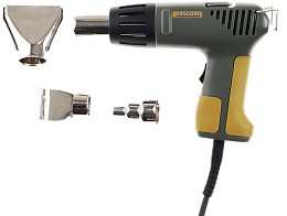 Пистолетът за горещ въздух е с две степени на температурата на нагряване, с вграден термостат за защита от прегряване. Накрайникът е от неръждаема стомана. В комплект с три допълнителни накрайника с различна форма.