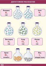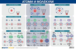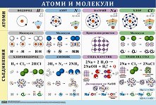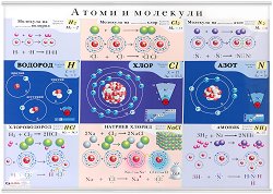 Учебното табло "Атоми и молекули" е ламинирано, с лайсни и въже за закачане. Таблото е с размери 70 x 100 cm. Таблото съдържа информация за: атом на водород; атом на хлор; атом на азот; молекула на водород; молекула на хлор; молекула на азот; хлороводород; натриев хлорид; амоняк. ... |