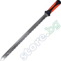 Строителният нож на Premium е предназначен за рязане на изолационни и пенообразни материали, като стъклена вата, минерална вата, стиропор, филц, полистирол и картон. Изработен е от неръждаема стомана и разполага с двустранно острие с дължина 42 cm, което е снабдено с фини зъбци от едната страна за рязане на меки материали и груби зъбци от другата - за плътни и твърди материали. Ножът има двукомпонентна дръжка с отвор за закачане, което осигурява комфорт и възможност за лесно съхранение. ... |