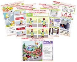 Комплектът включва 6 учебни табла по Безопасност на движението по пътищата за работа с деца в 3. група на детската градина. Темите на таблата са: табло № 1: Участници в движението; табло № 2: Познавам ли пътните знаци; табло № 3: Могат ли хората без превозни средства; табло № 4: Какво трябва да знае малкия пешеходец; табло № 5: Какво трябва да знае малкия пешеходец. Правила за безопасно пресичане; табло № 6: Какво трябва да знае малкия велосипедист. Всяко табло е с приблизителни размери 50 x 70 cm cm и има лайсни в горната и долната си част. По зададената тема има и задачи, с които да се провери и затвърди ...