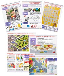 Комплектът включва 5 учебни табла по Безопасност на движението по пътищата за работа с деца във 2. група на детската градина. Темите на таблата са: табло № 1: Улицата; табло № 2: Светофар - мой другар; табло № 3: Улицата не е място за игра; табло № 4: Правила за пресичане; табло № 5: Моят велосипед. Табло № 3 е с размери 66.5 x 46.5 cm. Останалите табла са с размери 66 x 47 cm. Имат лайсни в горната и долната си част. По зададената тема има и задачи, с които да се провери и затвърди наученото. ...