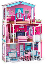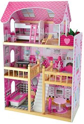 Ако детето ви обича да играе с кукли, то куклената къща от Viga Toys е точно за него! Тя представлява великолепен триетажен обзаведен дом за кукли. Куклената къща е изработена от дърво, боядисано в ярки цветове. Към къщата има включен и балкон, където куклите на вашето момиченце да разпускат. Стените на всяко от нивата са декорирани с нарисувани върху тях предмети, характерни за съответния интериор. На първия етаж са разположени банята и хола, на втория е кухнята, а на третия се намира спалнята с терасата. За къщата са включени разбира се и различни мебели като диванче, масички, столчета, легло, тоалетка, душ кабина, ...