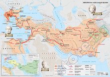 На стенната карта е представена и врезка "Наследници на Александър Велики". Характеристики: географска мрежа; хидрография; територия на империята на Александър Велики от държавата на Филип II до териториалните ѝ разширения при Александър Велики, зависими територии и други, представени чрез фоново оцветяване и щриховка; пустини; напоителни и плавателни канали; завоевателни походи и битки; столици и градове; градове основани от Александър Велики; надписи на хидрографията, орографията, историко-географски области и други; легенда. Характеристики на врезката: географска мрежа; хидрография; ... |