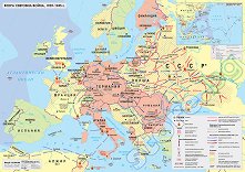 Характеристики: географска мрежа; държави в Европа и северозападна Африка, представени чрез държавни граници от 1.IX.1939 г. и фоново оцветяване, указващо принадлежност към воюващ лагер или неутралитет; обхват на окупираните от Оста територии, представен чрез щриховка; райони на действия на подводници; граница на СССР към 22.VI.1941 г.; хидрография; главни военни действия, включващи настъплението на германските войски 1941 г. и 1942 г., на руски и финландски войски (Съветско-финска война) 1939 - 1940 г., на Съюзническите сили и СССР, 1942 - 1945 г.; важни битки (вкл. морски); десантни операции; тежки ... |