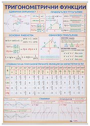 Двустранното учебното табло "Тригонометрични функции. Допълнителни зависимости в тригонометрията" е ламинирано, с лайсни и въже за закачане, с размери 70 x 100 cm. Учебното табло по математика е добър помощник за учениците занимаващи се с тригонометрия. ... |