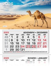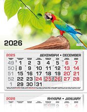 Характеристики на календара: 3 тела от 12 листа - на всеки лист по 1 месец (основен, предходен и предстоящ месец); фази на луната; имени дни; църковни празници; официални празници; съкращения на държавите, които честват свой празник на дадената дата; прозорче с ластици. ... |