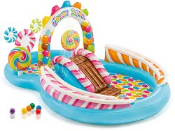 Надуваемият център за игра от "Intex" е подходящ за деца над 3 години. Той е голям - с приблизителни размери в напомпано състояние 295 / 191 / 130 cm и е изработен от висококачествен винилов материал. Детският център "Бонбонландия" има на разположение малък и голям басейн; вградена пързалка за спускане; дюшек за приземяване за допълнително удобство; арка с пръскалка, която се свързва с градински маркуч; 2 улея за спускане на включените в комплекта 6 пластмасови топки; 2 надуваеми близалки. Големият басейн е с капацитет 206 l, а малкият е с капацитет 168 l и е с дълбочина 14 cm. Надуваемият детски ... |