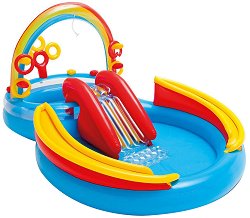 Лято, слънце, игри с приятели... А какво ни липсва, за да бъде забавлението пълно? Приохладата на водата, разбира се, която децата могат да намерят в надуваемия център от „ Intex “. Той се състои от два басейна, които са свързани с малка надуваема пързалка, както и още куп елементи, с които децата да се забавляват във водата. Над по-малкия басейн има надуваема арка, в която е вградена водна пръскалка (за да работи е необходимо да се свърже към градинския маркуч). Върху арката има надуваеми пинчета, на които децата да нанизват рингове, упражнявайки се да хвърлят точно. На борда на същия басейн има и надуваемо цвете, чиито ... |