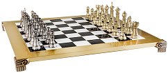 Понякога шахът се превръща в много повече от игра. Докато за едни предстоят първи стъпки в местенето на фигури и обмислянето на стратегически ходове, за други шахът вече е страст и любимо хоби. А за трети може да е дори и начин на живот, протичащ в турнири. За почитателите на играта шах от "Manopoulos" предлагат луксозен комплект, изработен с внимание към детайла. Той се състои от основа за игра на шах, кутия за съхранение и 32 фигури в сребрист и златист цвят. Игралното поле е с размери 44 x 44 cm. ...