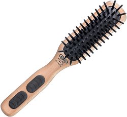 Вашата коса редовно се оплита, а имате желание тя да е винаги гладка и подредена, то значи имате нужда от подходящата четка за коса. От британските виртуози в създаването на сресващи пособия "Kent" до вашата коса пристига четка Mini hog - средно широка с 5 реда и букова дръжка с гумени вложки. Тя е изработена по технологията "Phat-Pin" за сплетени коси. Удебелените иглички са с деликатно заоблени краища и напомняйки за човешките пръсти лесно влизат в сплетените коси и нежно ги разплита без да ги накъсва. Четката е с основа наподобяваща въздушна възглавничка, която осигурява комфорт при разресване и ...