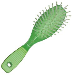 Овална четка за коса от "Titania" с пластмасови щифтове, чиито топчета щадят скалпа. Те не увреждат фоликулите на косъма и го предпазват от накъсване. При по-силен натиск по време на ресане от гъвкавата въздушна подложка тип "възглавница" се освобождава въздух през специален отвор, като това предотвратява захващането или накъсването на косата. С удобна гумирана дръжка за по-лесно захващане. С гъсто разположените си щифтове четката е подходяща за дълги или гъсти коси. Компактният ѝ размер я прави удобна за път. Размер на четката: 18 cm. ...