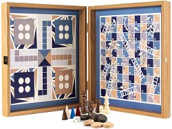 За почитателите на класическите игри от "Manopoulos" предлагат луксозен комплект, който ще бъде подходящ подарък за тях независимо от повода. Той се състои от кутия с основа за игра на "Шах", "Табла", "Не се сърди човече" и "Змии и стълби", дървени фигури за шах и дама, и пластмасови зарчета. Кутията е изработена от висококачествен дървен материал и в отворено състояние е с размери 34 x 68 cm. От вътрешната и външна страна кутията има игрални полета за 4 различни игри. ... |