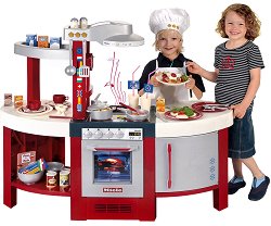 За разлика от своите майки, които не пускат в кухнята си друг човек, децата обичат да играят заедно, а в детската кухня на „ Klein “, оборудвана с умалени уреди-играчки „Miele“, могат да играят няколко малки готвача едновременно. Уредите в нея са разположени и от двете страни, което пести място и е изключително удобно. От едната страна е хладилника, фурната и шкафа с продукти, а от другата – съдомиялната. Вратичките на фурната и машината за миене на съдове се отварят, което прави играта още по-забавна. Върху печката има вграден плот с котлони, които при натискане на копчето за включване започват да издават звуци, като ... |