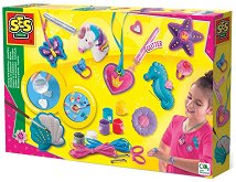 Комплектът на SES Creative ще даде възможност на децата да сътворят със собствените си ръце различни бижута с гипсови фигури и да ги оцветят с бои. Той включва всичко необходимо за създаването и оцветяването им - гипс, отливки, четка, цветни боички, шнурчета и аксесоари. Книжката с инструкции ще ви покаже стъпка по стъпка как да смесите гипса с вода. За целта гипсът се смесва с оказаното количество вода, излива се в отливките и се изсушава в продължение на 24 часа. Готовите фигурки се оцветяват с боите, като децата могат да проявят творчество или да следват модела. Боите могат да се смесват и да се създават нови ...