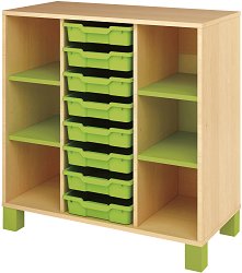 Органайзерът от Nowa Szkola е подходящ за детски стаи, класни стаи или учебни центрове. Изработен е от ламинирано ПДЧ в цвят бреза. Има 4 рафта с дебелина 18 mm в зелен цвят, както и 8 зелени плитки пластмасови кутии за съхранение, които се изваждат чрез издърпване. Органайзерът стои на 4 крака, които гарантират стабилност и дава достатъчно пространство за подреждане на учебни помагала, книги, играчки и други ученически пособия. Характеристики: 8 пластмасови плитки кутии за съхранение 4 рафта с дебелина 18 mm размери на кутиите: 31 / 42 / 7.3 cm материал на конструкцията: ПДЧ размери на краката: 7 x 10 cm ... |