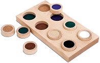 Дървената тактилна дъска е образователна игра, която развива осезанието. Състой се от 8 елемента (4 двойки), които са изработени от различни материали: кадифе, шкурка, филц, въже, пяна, лен, мрежа и вълна. Целта на играта е детето да съчетае кръгчетата с различни текстури в правилни двойки. Изисква се разпознаване на текстурите чрез допир, а съвпаденията се потвърждават чрез цветове. Основата е с размери 23 x 12 cm. ...