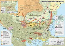 Стенна историческа карта на Националноосвободителните борби (1804 - 1869) и врезка - Дейност на БРЦК до 1875 г. Характеристики: географска мрежа; хидрография; територия на Османската империя, васални и други територии, райони на бунтове, въстанически движения и въстания в Северозападна България, райони на действие на хайдушките чети на Капитан Петко войвода и Ангел войвода и други райони, представени чрез ареали с фоново оцветяване и щриховка върху сенкорелеф; граници на зависими и независими държави; военни походи на руската армия; посоки на масово изселване на българи; път на четите на Панайот Хитов, Хаджи ... |