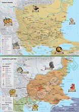 Характеристики на карта "Ранна Тракия": географска мрежа; хидрография; територия на ранна Тракия, II-началото на I хилядолетие пр. Хр., представена чрез фоново оцветяване върху сенкорелеф; древни селища и съвременни селища, край които са указани тракийски находки; със знаци са показани укрепени селища, светилища, долмени, некрополи, златни и сребърни съдове, бронзови сиптъри, медни слитъци и други; надписи на хидрография, орография, изобразени обекти и други; легенда; картинки на значими исторически находки от периода с указател за местоположението им. Характеристики на карта "Одриско Царство& ... |