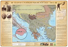 Картата проследява житейският и революционен път на Георги Раковски. Тя съдържа хронология на живота му, пет негови снимки и гравюри, информация за неговите идеи, основните му издания и други интересни детайли. Картата отразява и политическите граници към 1867 г. Характеристики: размери: 98 x 68 cm; без лайсни; без приспособления за закачане на стена; материал: гланцирана хартия, без ламинат. ... |