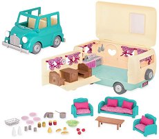 Автомобилът с каравана от "Battat" е оборудван с всичко необходимо, за да бъде почивката незабравима. В комплекта са включени над 30 фигурки - храни, напитки и обзавеждане. Едната страна и тавана на караваната се отварят. Отваряйки ги, детето ще се наслади на уютно и добре оборудвано кътче, с което да си играе дълги часове. То ще може също да мести всеки елемент от комплекта както пожелае. За още по-интересни и вълнуващи игри може да комбинирате комплекта с фигурките и останалите къщи с аксесоари от същата серия. Важно! Фигурките на животни показани на допълнителните снимки, може да закупите отделно. ...