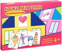 Комплектът "Кажи ми рими" се състои от 10 картонени къщи и 40 карти с различни илюстрации. Играта с него ще помогне на детето да усвои познавателните си умения и да се концентрира. В лицевата си страна всяка къща има изображение на покрива си, което съответства на дадена карта от тестето. А на гърба ѝ има 4 сенки, които отговарят на определена картинка от картите. "Римните" къщи са с дължина 29.7 cm, а размерът на картите е 6 x 9 cm. С комплекта могат да се играят 3 игри, подходящи за двама или повече участници. Ето и правилата на една от игрите. Кажи ми рими В играта могат да участват от 2 ...