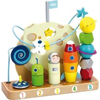 Детската играчка от "Vilac" е подходяща за най-малките любопитни астронавти. Играчката представлява съчетание от лабиринт и низанка. Лабиринтът е с две звездички и астронавт, които детето трябва да придвижи от едната страна до другата, като преминават покрай гигадската луна. Към самата луна има въртящ се кръг с магическа илюзия и звезда, която може да бъде местена на ляво и дясно. Низанката се състои от 5 различни по големина дървени колчета. Всяка позиция има точно определен брой елементи, които детето трябва да постави, за да на правилните места, така че да се образува космически кораб от 1 елемент, зелен ... |
