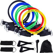 Ластиците за тренировки на Xmart идват в комплект от 5 броя с различно съпротивление от 4.6 до 22.6 kg. Подходящи са за поддържане и тонус на различни мускулни групи. Изработени са от високоеластичен нетоксичен материал. Възможна е употреба на всеки ластик поотделно или на всички заедно. Захващането става чрез здрави метални карабинери. В комплекта са включени 2 меки удобни за държане ръкохватки, 2 ленти за захващане към глезени, специален стопер за врата за закрепване към всяка стандартна врата, практична торба за съхранение и набор от упражнения за гърди, гръб, рамене, ръце, крака и бедра. ... |