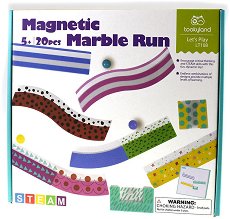 Комплектът от Tooky Toy позволява на децата да създадат своя собствена състезателна писта с магнити. Състои се от различни по дължина трасета, които могат да бъдат прикрепени към метална повърхност, като хладилник или бяла дъска, за да оформят уникално трасе. Играчката включва 16 елемента за изграждане на пистата и 4 цветни топчета, с които децата могат да експериментират и да наблюдават движението им. Всички части са удобно опаковани в кутия, подходяща за съхранение и подарък. Образователният комплект е вдъхновен от методологията STEM (Science, Technology, Engineering and Mathematics), създаден специално за ... |