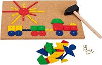 Виждали ли сте някога мозайка, която трябва да се заковава с чукче и пирончета? Ето я. Елементите й са в ярки цветове и с тяхна помощ детето се запознава с различните геометрични фигури. Подреждането и фиксирането им става с помощта на малък дървен чук и пирончета върху специална основа. С този творчески комплект детето развива своето въображение, научава цветовете, кои са основните геометрични фигури и свиква да работи с инструменти. Развива се фината моторика и координацията на движенията. Забиването на гвоздеите е лесно, защото в дървените елементи на мозайката има отвори, в които детето забива гвоздеите. Те са с ... |