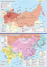 Характеристики на карта "Русия от XV до началото на XX век": мащаб 1:9 600 000; географска мрежа; държави; територия на Московското княжество в края на XIV век; териториално разширение на Русия от XV до началото на XX век, разделено на осем етапа; държавни граници към 1914 г.; важни битки при управлението на Петър I Велики; столици и градове; хидрография и надписи на хидрография, държави, историко-географски области, племена и други; легенда. Характеристики на карта "Индия, Китай, Япония XIX и началото на XX век": мащаб 1:9 000 000; географска мрежа; държави; колониални владения до ... |