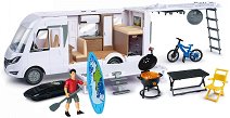 Отидете на къмпинг из природата с помощта на кемпера от Dickie. Той представлява умален модел на B-Class Hymer Camping Van. Разполага с въртящи се колела и мини фигурка, които гарантират забавлението. Щом намерите подходящо място за отдих може да отворите покрива, люка и страничния панел, за да видите детайлния интериор, състоящ се от мивка, легло, гардероб и бюро. Използвайте и включените в комплекта аксесоари като барбекю, маса, стол, сърфборд с гребло и колело. Барбекюто има светлинни ефекти, които се активират посредством бутон и допринасят за реализма в ролевите игри с кемпера. Кемперът е с размери 31 / 13.5 / 11 ...