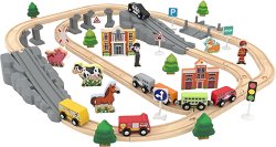 Малчуганите ще се впуснат в скоростни приключения с влакчето с релси. Комплектът включва дървени релси, мост, надлези, бариери, локомотив, вагони с магнитно закрепване, хеликоптер, камиончета, колички, дървета, храсти, пътни знаци, светофар, фигурки на животни и хора, придържащи елементи, сгради, магнитен кран и кръстовище. Децата могат да спазват правилата за движение като се научат да разпознават пътните знаци. Влакчето може да премине през гара, хеликоптерна площадка, мост и строителен кран. Комплектът е подходящ за разиграване на ролеви игри. Дайте шанс на децата да развият своето въображение, логическо мислене, фина ... |