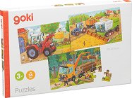 Комплектът на Goki се състои от 3 пъзела, всеки от 24 части. На тях са изобразени различни превозни средства - трактор, комбайн и камион. Реденето на пъзели спомага за детската концентрация и внимание към детайла. Всеки от пъзелите е с размери 27.5 x 17.5 cm. ...