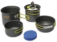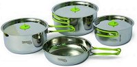 Комплектът туристически съдове за готвене на "Pinguin" е изработен от неръждаема стомана, а дръжките му са конструирани така, че да се сгъват плътно към съдовете, за да не заемат място. Съдовете са предназначени за приготвяне на храна за трима души. Характеристики: малка тенджера: размери - ∅ 152 x 66 mm вместимост - 1000 ml тегло - 185 g тегло на капака - 80 g средна тенджера: размери - ∅ 172 x 83 mm вместимост - 1500 ml тегло - 235 g тегло на капака - 100 g голяма тенджера: размери - ∅ 192 x 100 mm вместимост - 2250 ml тегло - 280 g тегло на капака - 120 g тиган: ... |