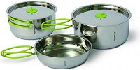 Комплектът туристически съдове за готвене на "Pinguin" е изработен от неръждаема стомана, а дръжките му са конструирани така, че да се сгъват плътно към съдовете, за да не заемат място. Съдовете са предназначени за приготвяне на храна за двама души. Характеристики: малка тенджера: размери - ∅ 192 x 100 mm вместимост - 2250 ml тегло - 280 g тегло на капака - 120 g голяма тенджера: размери - ∅ 212 x 117 mm вместимост - 3000 ml тегло - 340 g тегло на капака - 150 g тиган: размери - ∅ 215 x 55 mm вместимост - 1600 ml тегло - 245 g ... |