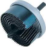 Кръговата боркорона на Wolfcraft е подходяща за дърво, гипсокартон, строителни панели и цветни метали. Тя разполага с центриращо свредло с диаметър ∅ 8 mm, шестостенна опашка и сменяеми режещи ленти с висока мощност на рязане. Боркороната се предлага със 7 бързосменяеми пластини с диаметър ∅ 25, 32, 38, 45, 50, 56, 62 mm и има опашка с диаметър ∅ 7 mm. Дълбочината ѝ на пробиване е 33 mm. Продуктът притежава сертификат TÜV за безопасност и качество. ... |
