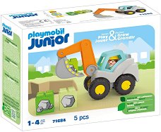 Комплектът е част от серията Junior, където ще откриете още конструктори, фигурки и комплекти по темата. ... Комплектът на Playmobil ще зарадва всяко дете. Той се състои от 5 части, които включват фигурка на човече, багер и 3 кубчета. Те са изработени с изображения на камъни, която съответства на различна цифра - 1, 2 и 3. Освен това те могат да бъдат подреждани и като кула. Багерът има подвижна лопата, с която да загребва "камъните". Освен това той може да бъде бутан напред и назад. С елементите детето ще може да разиграе различни ролеви игри, които ще създаде чрез своето въображение. ...