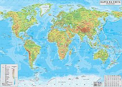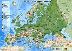 Двустранна ученическа карта. ... Характеристики на картата: Размери на картата 29.5 х 21 cm. Мащаб на природогеографската карта на Европа: 1:22 000 000 Мащаб на политическата карта на Света: 1:168 000 Картата включва: залежи на полезни изкопаеми: горивни, рудни и нерудни; най-големи държави по площ; население на света; най-голями градове и агломерации в света; списък на държавите по континенти (с номерация). ... |