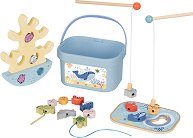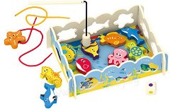 Изпробвайте уменията си на изкусен рибар и примамете водните обитатели с въдицата, така че сами да се закачат на нея. Поканете свои приятели и направете играта още по-забавна. Играта Риболов е подходяща за деца над 3-годишна възраст. С нея малчуганите ще тренират своята концентрация, ловкост и бързина. Комплектът се състои от игрално поле, цветно зарче, 10 фигурки на морски обитатели, 2 въдици и 2 цветни връзки за нанизване. Елементите са изработени от дърво, боядисано с безвредни бои на водна основа, а на краищата на въдиците има вградени магнити, с които да се ловят фигурките. Идеята на играта е участниците да хвърлят ... |