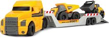 Комплектът от "Dickie" ще зарадва всяко дете, което харесва големите тежкотоварни машини. Той се състои от камион с голямо ремарке, с което превозва мини самосвал и багер. Ремаркето има подвижни елементи - като при истинските камиони, то може да се вдига и сваля, каросерията на самосвала и лопатата на багера се движат нагоре и надолу. Играчките ще осигурят часове забавление на вашето дете! Приблизителната дължина на камиона е 33 cm, а на самосвала и багера е 9 cm. ... |